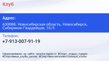 Клуб по адресу 630088, Новосибирская область, Новосибирск, Сибиряков-Гвардейцев, 51/1 в дальнейшем Организация, размещена в следующих категориях: