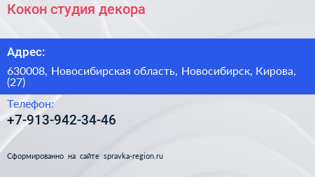 Кокон, студия декора по адресу 630008, Новосибирская область, Новосибирск, Кирова, (27) в дальнейшем Организация, размещена в следующих категориях: