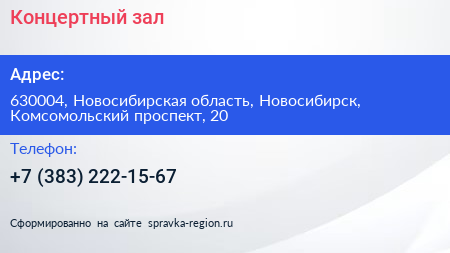 Концертный зал по адресу 630004, Новосибирская область, Новосибирск, Комсомольский проспект, 20 в дальнейшем Организация, размещена в следующих категориях: