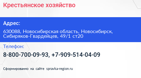 Крестьянское хозяйство по адресу 630088, Новосибирская область, Новосибирск, Сибиряков-Гвардейцев, 49/1 ст20 в дальнейшем Организация, размещена в следующих категориях: