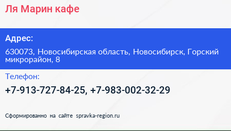 Ля Марин, кафе по адресу 630073, Новосибирская область, Новосибирск, Горский микрорайон, 8 в дальнейшем Организация, размещена в следующих категориях:
