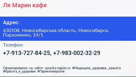 Ля Марин, кафе по адресу 630108, Новосибирская область, Новосибирск, Пархоменко, 14/1 в дальнейшем Организация, размещена в следующих категориях:
