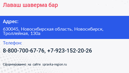 #Лаваш, шаверма-бар по адресу 630045, Новосибирская область, Новосибирск, Троллейная, 130а в дальнейшем Организация, размещена в следующих категориях: