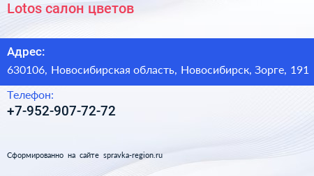 Lotos, салон цветов по адресу 630106, Новосибирская область, Новосибирск, Зорге, 191 в дальнейшем Организация, размещена в следующих категориях: