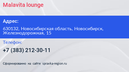 Malavita lounge по адресу 630132, Новосибирская область, Новосибирск, Железнодорожная, 15 в дальнейшем Организация, размещена в следующих категориях:
