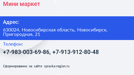 Мини-маркет по адресу 630024, Новосибирская область, Новосибирск, Пригородная, 21 в дальнейшем Организация, размещена в следующих категориях: