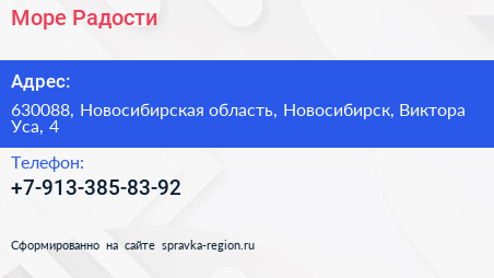 Море Радости по адресу 630088, Новосибирская область, Новосибирск, Виктора Уса, 4 в дальнейшем Организация, размещена в следующих категориях: