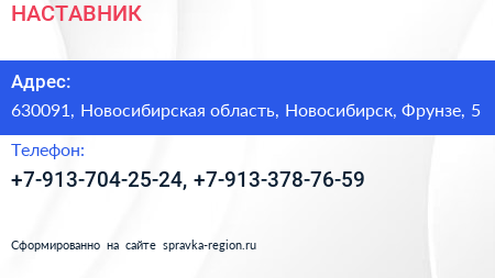 НАСТАВНИК по адресу 630091, Новосибирская область, Новосибирск, Фрунзе, 5 в дальнейшем Организация, размещена в следующих категориях: