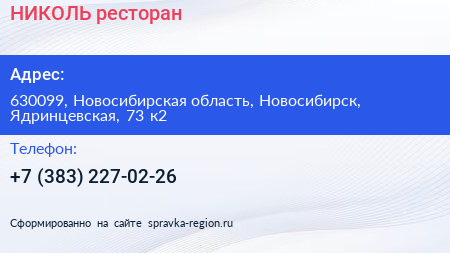 НИКОЛЬ, ресторан по адресу 630099, Новосибирская область, Новосибирск, Ядринцевская, 73 к2 в дальнейшем Организация, размещена в следующих категориях: