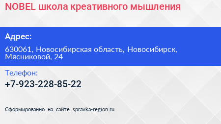 NOBEL, школа креативного мышления по адресу 630061, Новосибирская область, Новосибирск, Мясниковой, 24 в дальнейшем Организация, размещена в следующих категориях: