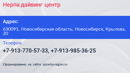 Нерпа, дайвинг-центр по адресу 630091, Новосибирская область, Новосибирск, Крылова, 20 в дальнейшем Организация, размещена в следующих категориях: