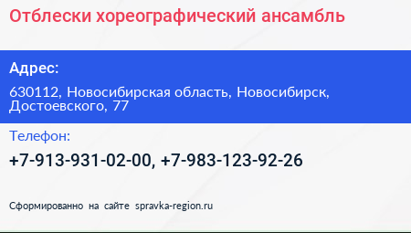 Отблески, хореографический ансамбль по адресу 630112, Новосибирская область, Новосибирск, Достоевского, 77 в дальнейшем Организация, размещена в следующих категориях: