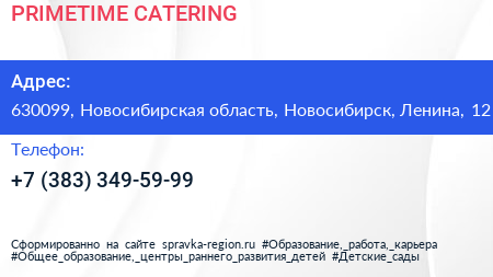 PRIMETIME CATERING по адресу 630099, Новосибирская область, Новосибирск, Ленина, 12 в дальнейшем Организация, размещена в следующих категориях:
