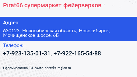 Pirat66, супермаркет фейерверков по адресу 630123, Новосибирская область, Новосибирск, Мочищенское шоссе, 6Б в дальнейшем Организация, размещена в следующих категориях: