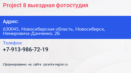 Project.8, выездная фотостудия по адресу 630045, Новосибирская область, Новосибирск, Немировича-Данченко, 2Б в дальнейшем Организация, размещена в следующих категориях: