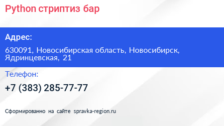 Python, стриптиз-бар по адресу 630091, Новосибирская область, Новосибирск, Ядринцевская, 21 в дальнейшем Организация, размещена в следующих категориях:
