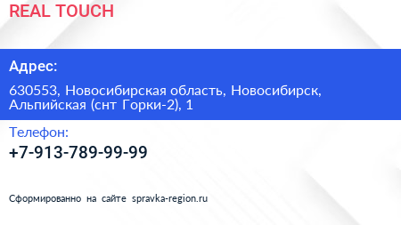 REAL TOUCH по адресу 630553, Новосибирская область, Новосибирск, Альпийская (снт Горки-2), 1 в дальнейшем Организация, размещена в следующих категориях: