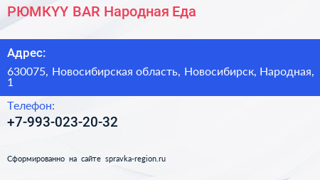 РЮМКYY BAR Народная Еда по адресу 630075, Новосибирская область, Новосибирск, Народная, 1 в дальнейшем Организация, размещена в следующих категориях: