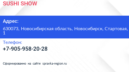 SUSHI SHOW по адресу 630073, Новосибирская область, Новосибирск, Стартовая, 1 в дальнейшем Организация, размещена в следующих категориях: