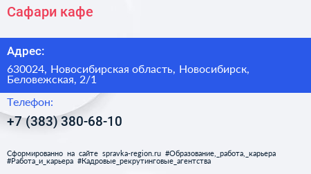Сафари, кафе по адресу 630024, Новосибирская область, Новосибирск, Беловежская, 2/1 в дальнейшем Организация, размещена в следующих категориях:
