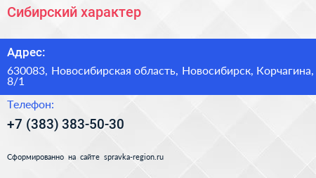 Сибирский характер по адресу 630083, Новосибирская область, Новосибирск, Корчагина, 8/1 в дальнейшем Организация, размещена в следующих категориях:
