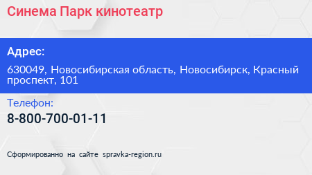 Синема Парк, кинотеатр по адресу 630049, Новосибирская область, Новосибирск, Красный проспект, 101 в дальнейшем Организация, размещена в следующих категориях: