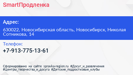 SmartПродленка по адресу 630022, Новосибирская область, Новосибирск, Николая Сотникова, 14 в дальнейшем Организация, размещена в следующих категориях: