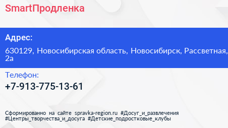 SmartПродленка по адресу 630129, Новосибирская область, Новосибирск, Рассветная, 2а в дальнейшем Организация, размещена в следующих категориях: