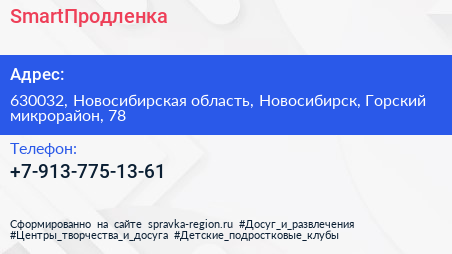SmartПродленка по адресу 630032, Новосибирская область, Новосибирск, Горский микрорайон, 78 в дальнейшем Организация, размещена в следующих категориях:
