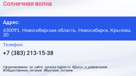 Солнечная волна по адресу 630091, Новосибирская область, Новосибирск, Крылова, 20 в дальнейшем Организация, размещена в следующих категориях: