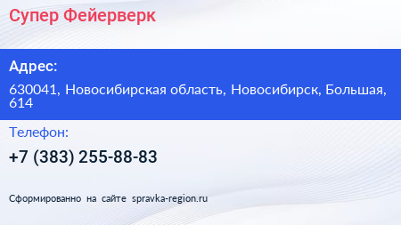 Супер Фейерверк по адресу 630041, Новосибирская область, Новосибирск, Большая, 614 в дальнейшем Организация, размещена в следующих категориях: