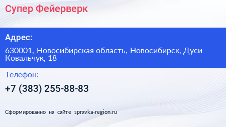 Супер Фейерверк по адресу 630001, Новосибирская область, Новосибирск, Дуси Ковальчук, 18 в дальнейшем Организация, размещена в следующих категориях: