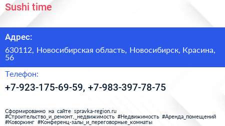 Sushi time по адресу 630112, Новосибирская область, Новосибирск, Красина, 56 в дальнейшем Организация, размещена в следующих категориях: