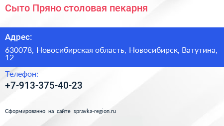 Сыто-Пряно, столовая-пекарня по адресу 630078, Новосибирская область, Новосибирск, Ватутина, 12 в дальнейшем Организация, размещена в следующих категориях:
