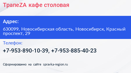 ТрапеZA, кафе-столовая по адресу 630099, Новосибирская область, Новосибирск, Красный проспект, 29 в дальнейшем Организация, размещена в следующих категориях: