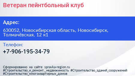 Ветеран, пейнтбольный клуб по адресу 630052, Новосибирская область, Новосибирск, Толмачёвская, 12 к1 в дальнейшем Организация, размещена в следующих категориях: