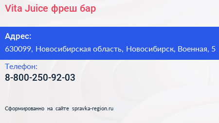 Vita Juice, фреш-бар по адресу 630099, Новосибирская область, Новосибирск, Военная, 5 в дальнейшем Организация, размещена в следующих категориях: