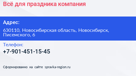 Всё для праздника, компания по адресу 630110, Новосибирская область, Новосибирск, Писемского, 6 в дальнейшем Организация, размещена в следующих категориях:
