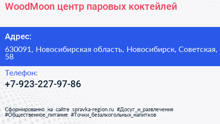 WoodMoon, центр паровых коктейлей по адресу 630091, Новосибирская область, Новосибирск, Советская, 58 в дальнейшем Организация, размещена в следующих категориях: