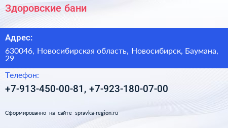 Здоровские бани по адресу 630046, Новосибирская область, Новосибирск, Баумана, 29 в дальнейшем Организация, размещена в следующих категориях: