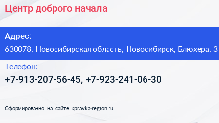 Центр доброго начала по адресу 630078, Новосибирская область, Новосибирск, Блюхера, 3 в дальнейшем Организация, размещена в следующих категориях: