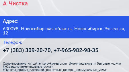А-Чистка по адресу 630098, Новосибирская область, Новосибирск, Энгельса, 12 в дальнейшем Организация, размещена в следующих категориях: