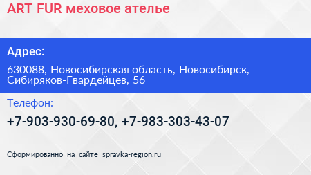 ART-FUR, меховое ателье по адресу 630088, Новосибирская область, Новосибирск, Сибиряков-Гвардейцев, 56 в дальнейшем Организация, размещена в следующих категориях: