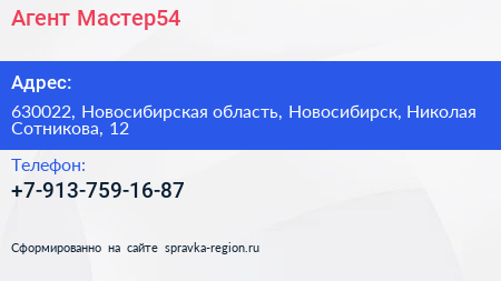 Агент-Мастер54 по адресу 630022, Новосибирская область, Новосибирск, Николая Сотникова, 12 в дальнейшем Организация, размещена в следующих категориях: