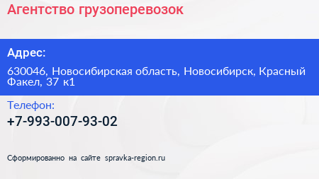 Агентство грузоперевозок по адресу 630046, Новосибирская область, Новосибирск, Красный Факел, 37 к1 в дальнейшем Организация, размещена в следующих категориях:
