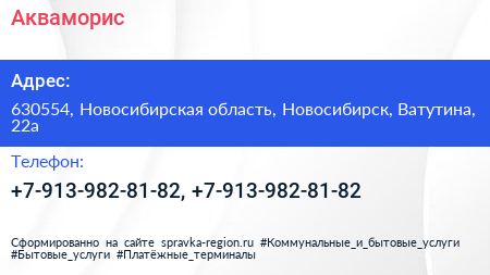 Акваморис по адресу 630554, Новосибирская область, Новосибирск, Ватутина, 22а в дальнейшем Организация, размещена в следующих категориях: