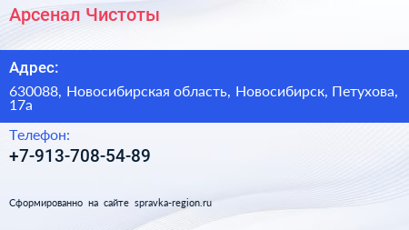 Арсенал Чистоты по адресу 630088, Новосибирская область, Новосибирск, Петухова, 17а в дальнейшем Организация, размещена в следующих категориях: