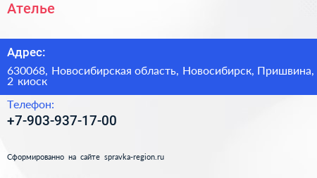 Ателье по адресу 630068, Новосибирская область, Новосибирск, Пришвина, 2 киоск в дальнейшем Организация, размещена в следующих категориях: