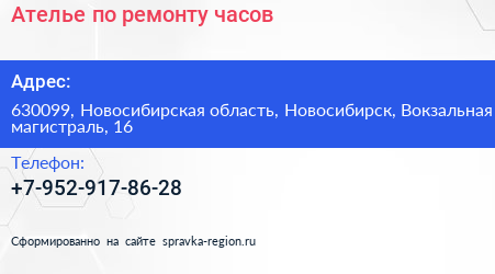 Ателье по ремонту часов по адресу 630099, Новосибирская область, Новосибирск, Вокзальная магистраль, 16 в дальнейшем Организация, размещена в следующих категориях: