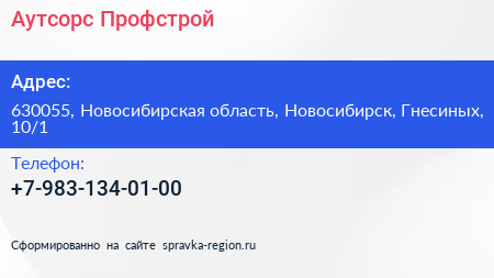 Аутсорс Профстрой по адресу 630055, Новосибирская область, Новосибирск, Гнесиных, 10/1 в дальнейшем Организация, размещена в следующих категориях: